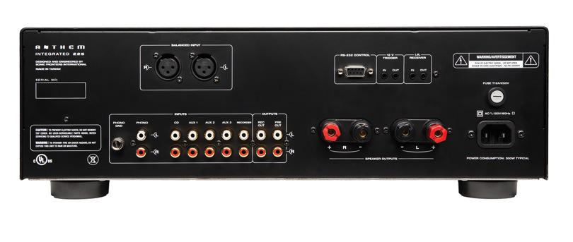 В сигнальных цепях high-end усилителя Anthem Integrated 225 используются металлопленочные резисторы и фольговые конденсаторы. В блоке питания стоит тороидальный трансформатор и два конденсатора Nichicon в фильтре, суммарной емкостью 30 000 мкФ. Предварительные усилители оснащены цепями точной стабилизации напряжения ±15 В. Усилитель мощности имеет полностью симметричную схему с тремя парами биполярных транзисторов на каждое плечо. Большие радиаторы охлаждения выходных каскадов, конструкция которых была просчитана и смоделирована на компьютере, обеспечивают эффективный отвод тепла. Дизайн тяжелой (почти двадцатикилограммовой) модели вызывает желание охарактеризовать ее как традиционный и даже, возможно, чуть старомодный аппарат. Почти по всей площади верхней крышки цельнометаллического корпуса из толстого (2,5 мм) стального листа расположено множество вентиляционных прорезей. Акустические клеммы не предполагают использование бивайринга и на вид довольно простые, однако «бананы» кабелей фиксируются в них хорошо и надежно. По передней панели из шлифованного алюминия расположены управляющие кнопки и ручки разной величины; дисплей отсутствует.