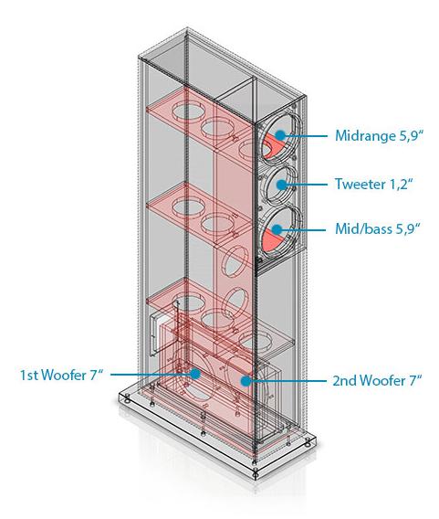 30-миллиметровый купольный твитер снабжен накладкой из поролона. Над нижней опорной плитой размещается пара 7-дюймовых НЧ-динамиков.