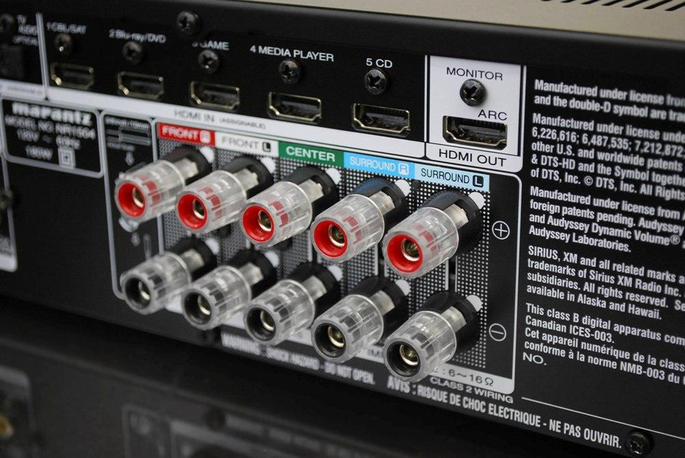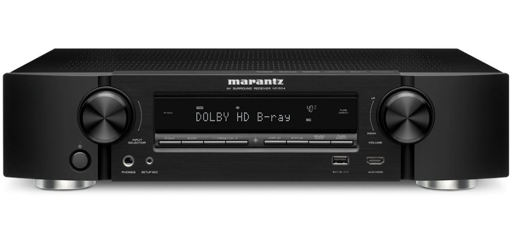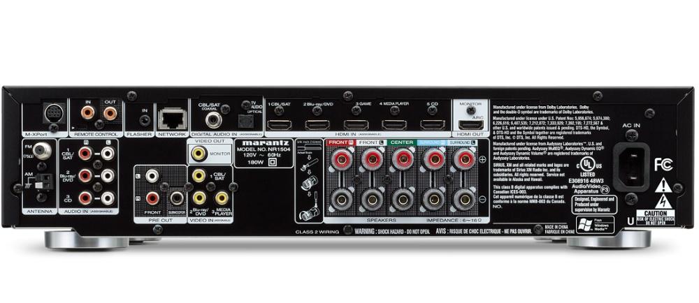 Marantz NR-1504 оснащен разъемами под 5 каналов, пятью HDMI-входами сзади и одним спереди. Также на передней панели расположен USB-разъем, через который можно подключить iOS-устройства, а также и другие гаджеты (не только от Apple). По словам Marantz, сюда можно подключить и USB-накопитель и воспроизводить с него музыку. Выход HDMI 1.4 поддерживает передачу 3D, возвратный аудиоканал ARC, Deep Color, режим ожидания и HDMI-CEC. Есть три композитных видео-входа и один выход (без up-конверсии аналогового видео до HDMI) Также у NR-1504 есть три пары аналоговых аудиовходов RCA, а также один коаксиальный и один оптический цифровые входы. Есть выходы для подключения внешнего усилителя.