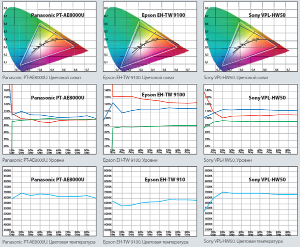 На графиках Epson EH-TW 9100 демонстрирует самую высокую яркость изображения и насыщенность. В режиме «Сinema» несколько другие требования к цветопередаче — изображение должно быть без перенасыщенных цветов, без завалов по цветовой температуре в «холод» или «тепло» (раз уж заявлено 6500 K). Проектор продемонстрировал потенциал, а вот настраивать до нормы — необходимо. Зато, этот проектор — один из самых доступных по цене среди участников теста.