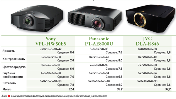 Методика просмотра была предельно проста: один и тот же отрывок, без пауз, просматривался на разных аппаратах, чередуемых под анонимными номерами в случайном порядке. У экспертов имелись бланки протоколов, в которых проекторы фигурировали под анонимными номерами. Оценка изображения проводилась по следующим параметрам: яркость, контрастность, цветопередача, глубина изображения, четкость, комфорт просмотра. Последний параметр в итоговой таблице не фигурирует, поскольку он был молчаливо проигнорирован большинством экспертов.
