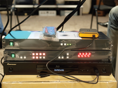 Источниками контента служили как Blu-ray диск, так и 2,5-дюймовый жесткий диск. В обоих случаях за воспроизведение отвечал Blu-ray медиаплеер Pioneer BDP-150, подсоединенный к усилителю-распределителю сигналов HDMI Kramer VM‑4Hxl и матричному коммутатору 4x4 Kramer VS-44HN.
