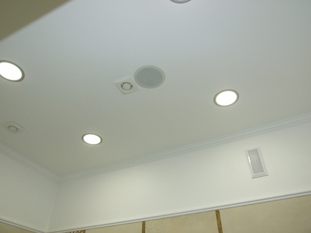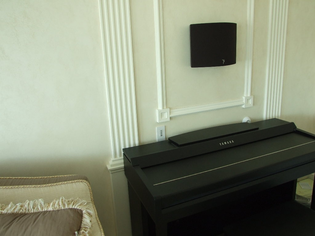 В данном ресивере Yamaha есть функция второй независимой зоны озвучивания, которая была успешно реализована в санузле для спальни. Такая функция позволяет организовать фоновый звук (например, интернет радио или FM) независимо от основного помещения по громкости и выбору источника. Для этого мы использовали влагозащищенную потолочную стерео акустическую систему. Управление кинотеатром и дополнительной зоной (санузлом) осуществляется универсальным пультом. В том числе звуком в санузле можно управлять при помощи любого смартфона, планшета и при этом на экране смартфона, планшета Вы можете видеть название треков, название радио и интернет станций, выбранный уровень громкости. Также в данном ресивере реализована функция AIR play.