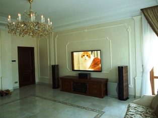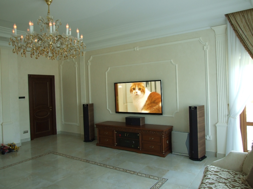 Первый заказ мы выполнили у него на квартире. Но как говорится: «Каждый мужчина должен построить дом, вырастить сына и посадить дерево». Кинотеатр расположен в гостиной с большой площадью. Дом в основном используется для отдыха. Наша задача была оборудовать кинотеатр с хорошим качеством и при этом не тратить на него большие средства. С задачей помогли справится: трех-полосная фронтальная акустика Focal JM-Lab Chorus 836 V (пожалуй одна из самых мощных и басовитых в своем классе), центральный канал из той же серии, тыловые дипольные акустические системы Focal JM-Lab Chorus SR 800 V позволяют наполнить даже большое помещение подробным окружающим звуком. Сердцем домашнего кинотеатра стал ресивер Onkyo и медиаплеер от компании Dune.
