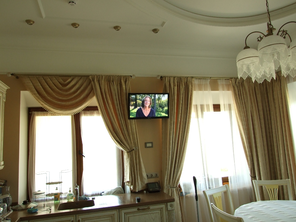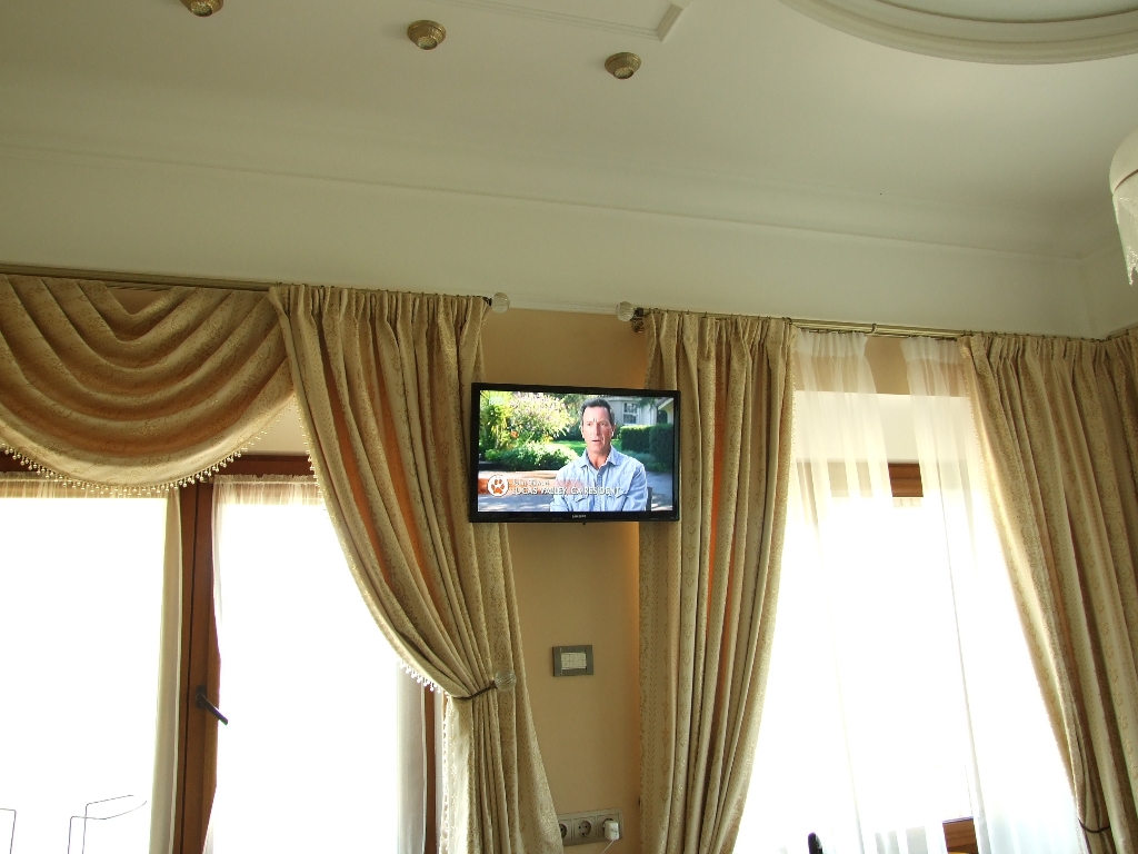 Телевизор в кухне на поворотном креплении получает сигнал высокой четкости с тюнера расположенного в гостиной без потери качества. Передача HDMI сигнала на такое большое расстояние реализовано преобразователями (передатчик, приемник) сигнала высокой четкости по витой паре.