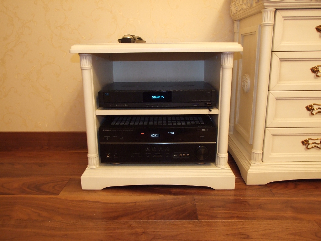 Второй небольшой кинотеатр 4.1 (без центрального канала) находится в спальне. Реализован на дизайнерской линейке акустических систем Focal JM-Lab Sib & Co. Не смотря на небольшие размеры акустика весьма впечатляет своим напором и детальностью в звуке. Это позволило нам исключить из комплекта центральный канал в пользу интерьера. Сабвуфер выполнен в виде кубика и очень хорошо сопрягается с акустическими системами по басу. В качестве усиления мы использовали ресивер Yamaha, который хорошо сочетается с детальными по звуку «фокалами». В качестве универсального проигрывателя используется медиаплеер Dune HD Max.