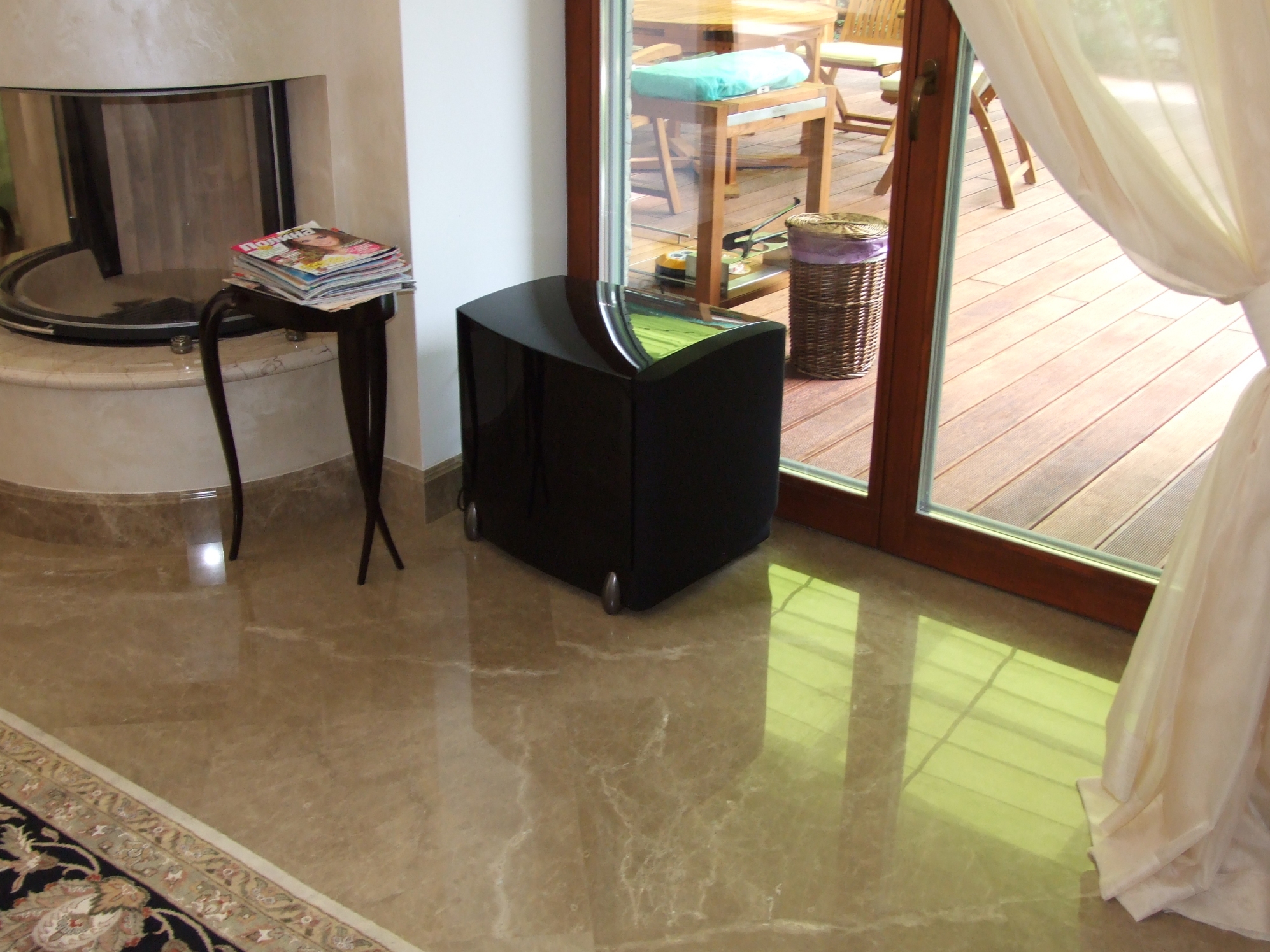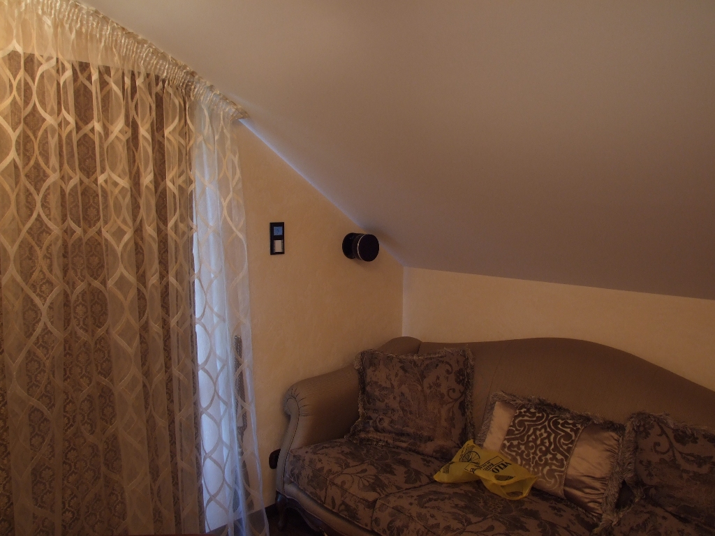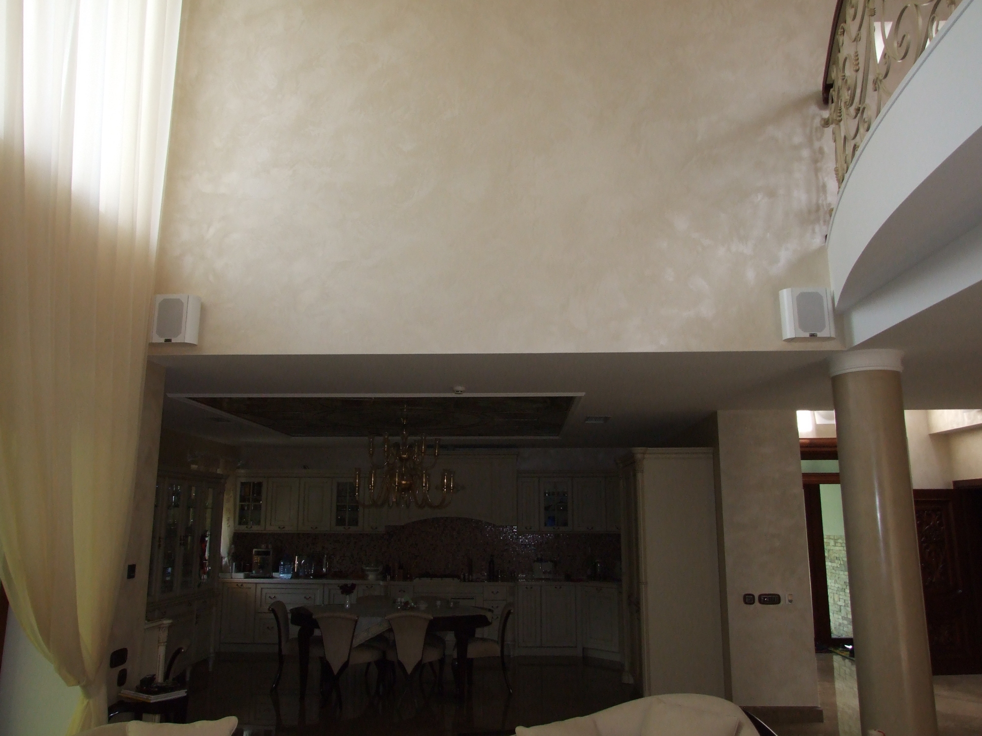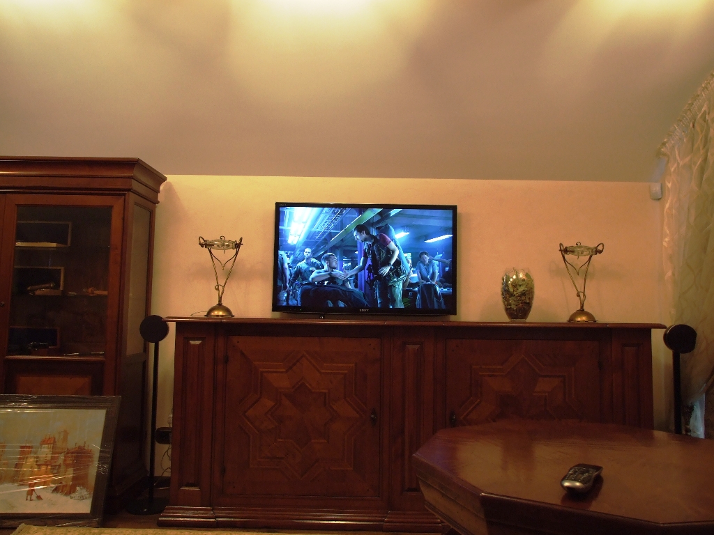 В гостиной, на первом этаже, расположился основной кинотеатр High-End уровня. Передняя акустика -Audio Physic Avantera, центральная акустика - Audio Physic High End Center 25, тыл Audio Physic Sky High. Площадь комнаты 130 м.кв. , поэтому сабвуфер выбран внушительных размеров Paradigm Signature 25 с динамиком 15 дюймов (38 см). Сабвуфер должным образом не зазвучал в изначально предполагаемом месте справа возле акустики, поэтому, пришлось искать ему новое правильное место. Оказалось, лучше всего он звучит возле камина. Так как ремонт был уже готов и кабель прокладывать уже было поздно, проблему удалось решить с помощью wi-fi передатчика сигнала - 300$ звук отличный и проводов нет.